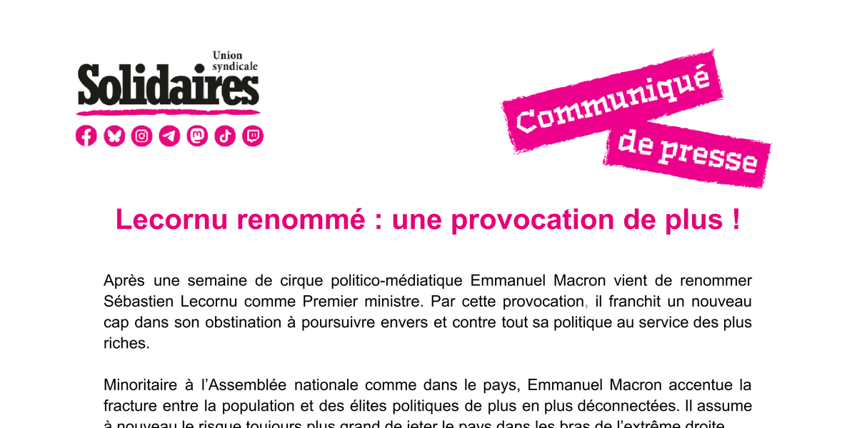 Après une semaine de cirque politico-médiatique Emmanuel Macron vient de renommer Sébastien Lecornu comme Premier ministre. Par cette provocation, il franchit un nouveau cap dans son obstination à poursuivre envers et contre tout sa politique au service des plus riches.