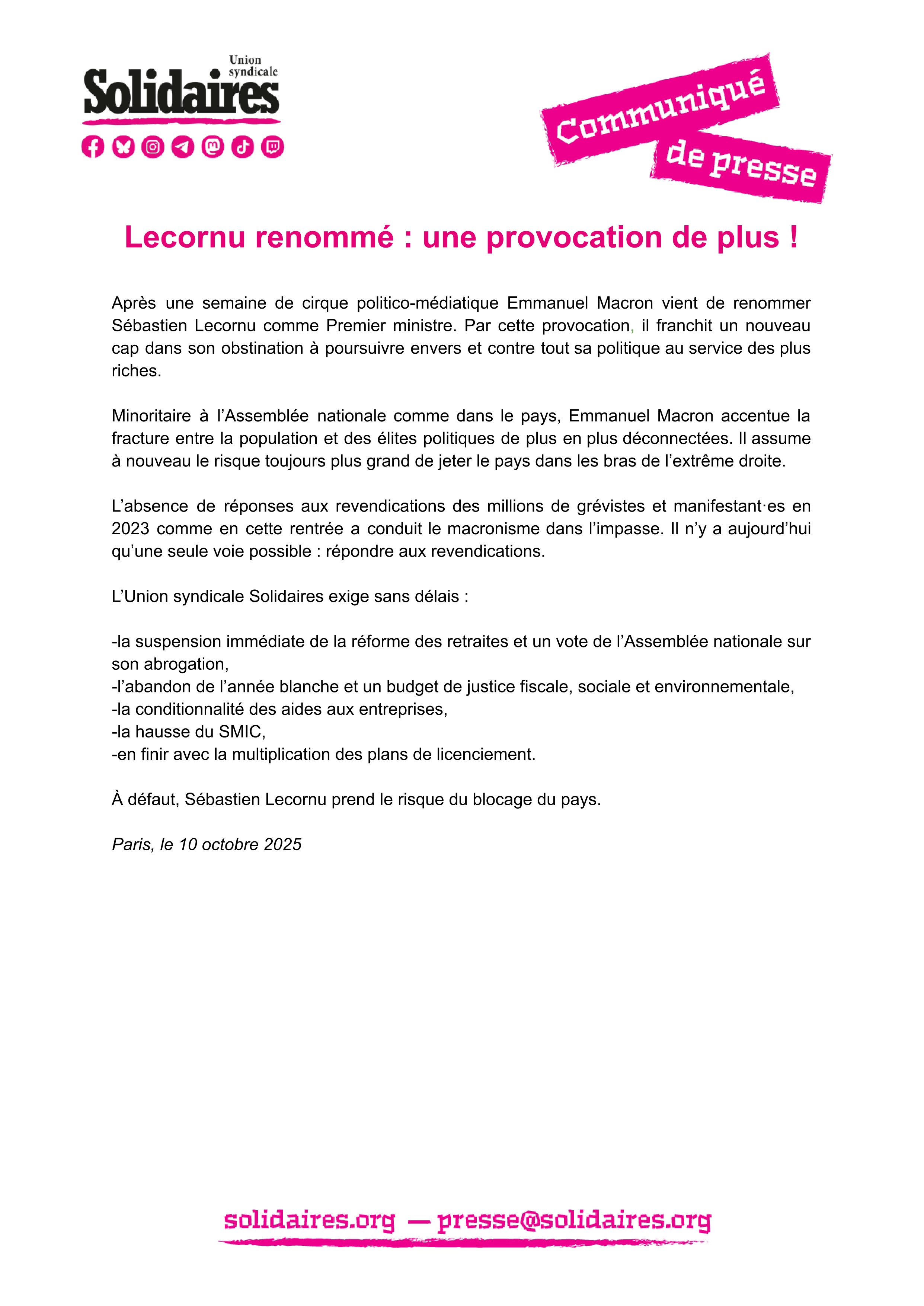 L’Union syndicale Solidaires exige sans délais :