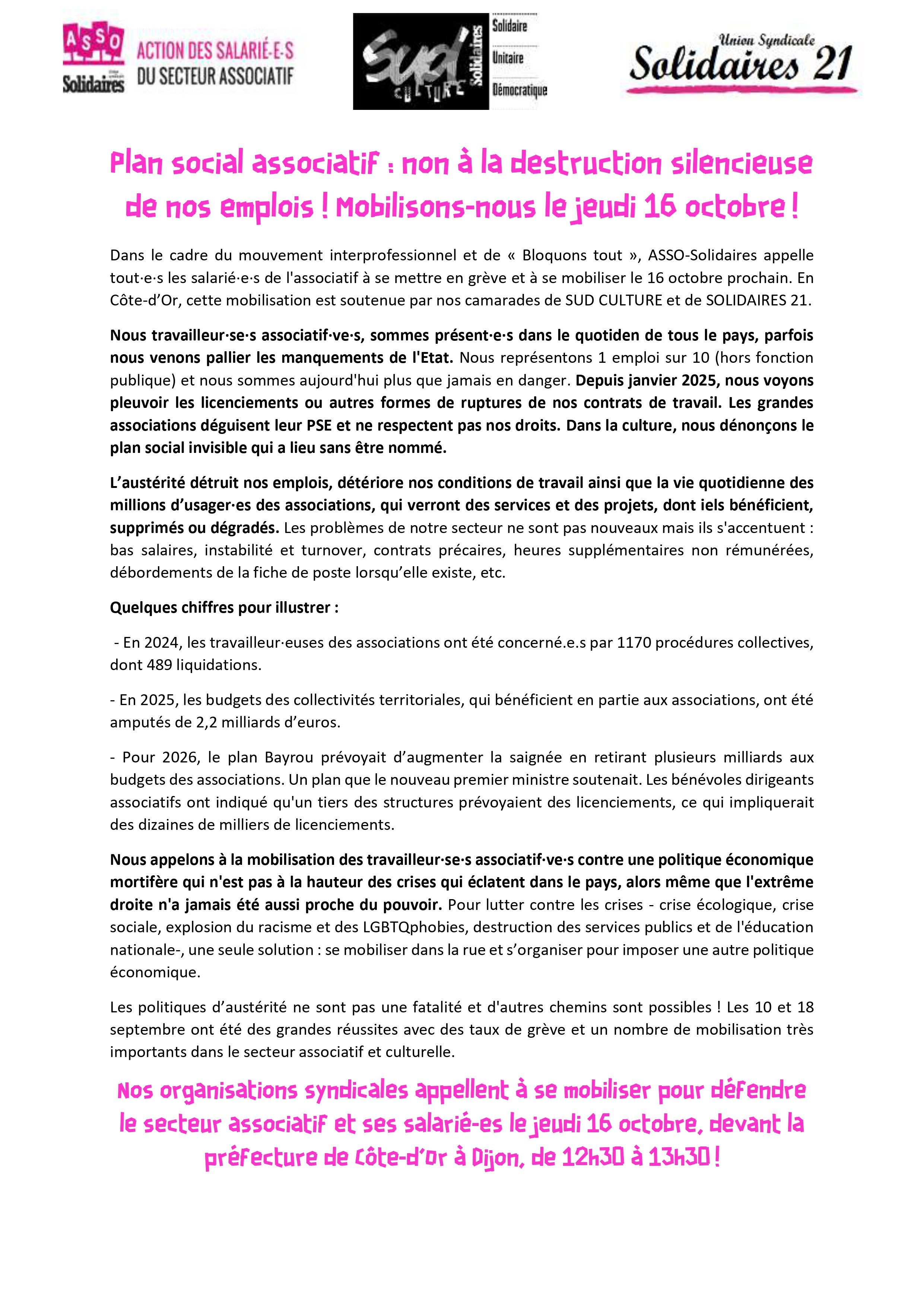Dans le cadre du mouvement interprofessionnel et de « Bloquons tout », ASSO-Solidaires appelle tout·e·s les salarié·e·s de l'associatif à se mettre en grève et à se mobiliser le 16 octobre prochain. En Côte-d’Or, cette mobilisation est soutenue par nos camarades de SUD CULTURE et de SOLIDAIRES 21. Nous travailleur·se·s associatif·ve·s, sommes présent·e·s dans le quotiden de tous le pays, parfois nous venons pallier les manquements de l'Etat. Nous représentons 1 emploi sur 10 (hors fonction publique) et nous sommes aujourd'hui plus que jamais en danger. Depuis janvier 2025, nous voyons pleuvoir les licenciements ou autres formes de ruptures de nos contrats de travail. Les grandes associations déguisent leur PSE et ne respectent pas nos droits. Dans la culture, nous dénonçons le plan social invisible qui a lieu sans être nommé. L’austérité détruit nos emplois, détériore nos conditions de travail ainsi que la vie quotidienne des millions d’usager·es des associations, qui verront des services et des projets, dont iels bénéficient, supprimés ou dégradés. Les problèmes de notre secteur ne sont pas nouveaux mais ils s'accentuent : bas salaires, instabilité et turnover, contrats précaires, heures supplémentaires non rémunérées, débordements de la fiche de poste lorsqu’elle existe, etc. Quelques chiffres pour illustrer : - En 2024, les travailleur·euses des associations ont été concerné.e.s par 1170 procédures collectives, dont 489 liquidations. - En 2025, les budgets des collectivités territoriales, qui bénéficient en partie aux associations, ont été amputés de 2,2 milliards d’euros. - Pour 2026, le plan Bayrou prévoyait d’augmenter la saignée en retirant plusieurs milliards aux budgets des associations. Un plan que le nouveau premier ministre soutenait. Les bénévoles dirigeants associatifs ont indiqué qu'un tiers des structures prévoyaient des licenciements, ce qui impliquerait des dizaines de milliers de licenciements. Nous appelons à la mobilisation des travailleur·se·s associatif·ve·s contre une politique économique mortifère qui n'est pas à la hauteur des crises qui éclatent dans le pays, alors même que l'extrême droite n'a jamais été aussi proche du pouvoir. Pour lutter contre les crises - crise écologique, crise sociale, explosion du racisme et des LGBTQphobies, destruction des services publics et de l'éducation nationale-, une seule solution : se mobiliser dans la rue et s’organiser pour imposer une autre politique économique. Les politiques d’austérité ne sont pas une fatalité et d'autres chemins sont possibles ! Les 10 et 18 septembre ont été des grandes réussites avec des taux de grève et un nombre de mobilisation très importants dans le secteur associatif et culturelle. Nos organisations syndicales appellent à se mobiliser pour défendre le secteur associatif et ses salarié-es le jeudi 16 octobre, devant la préfecture de Côte-d’Or à Dijon, de 12h30 à 13h30 !