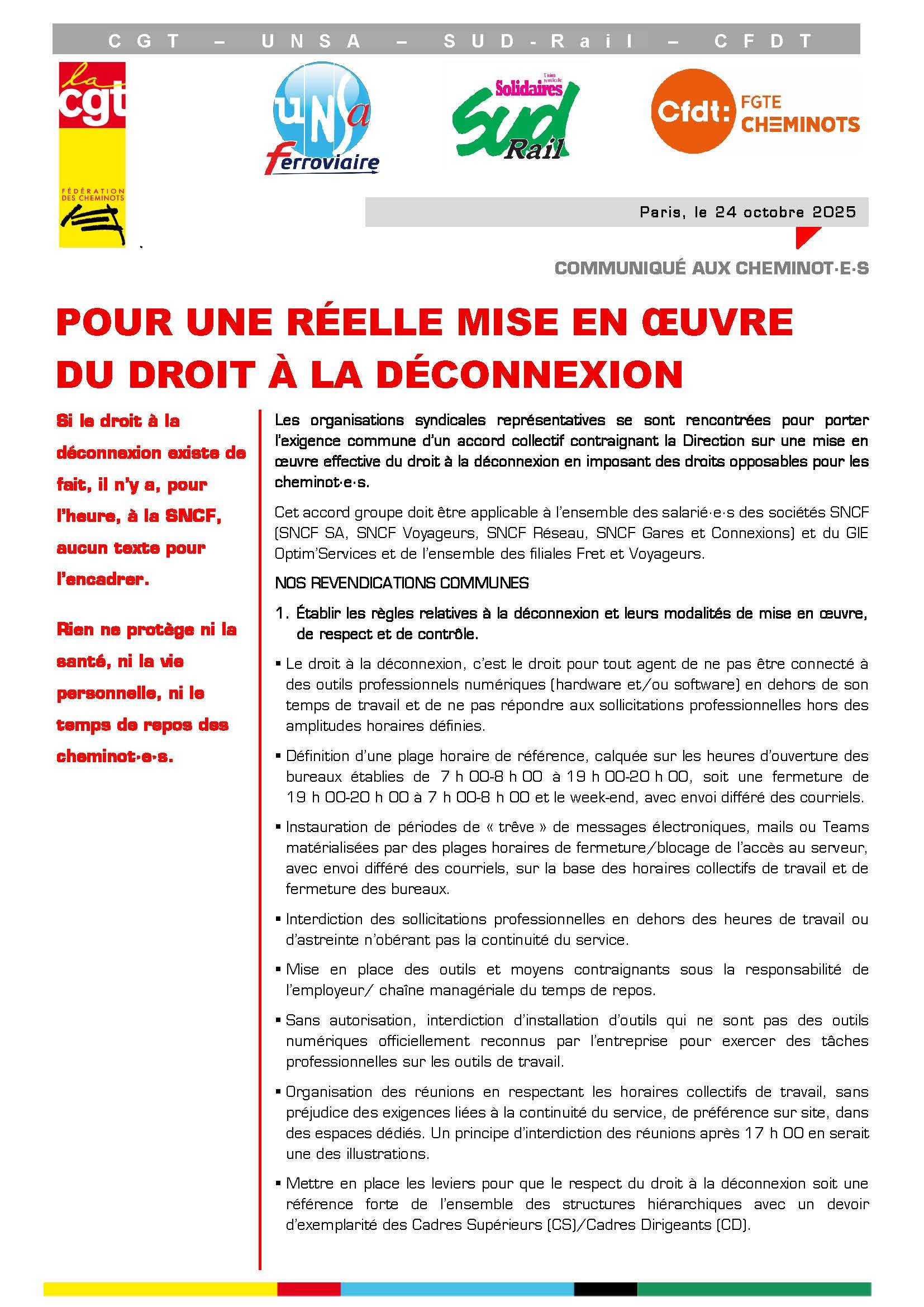 Les organisations syndicales CGT Cheminots, UNSA Ferroviaire, SUD-Rail et CFDT Cheminots s’engagent à défendre cette plateforme revendicative unitaire dans les différentes réunions à venir dans le cadre de la négociation. Pour garantir les droits des cheminot·e·s., alléger leur charge mentale et préserver leur santé.
